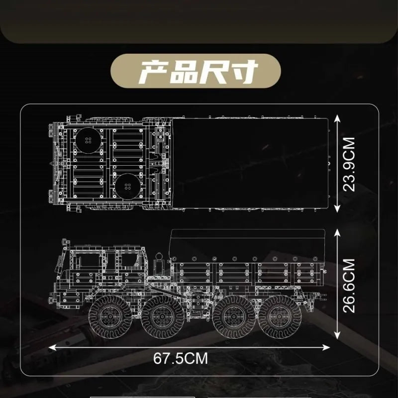 Dit model is ontworpen met oog voor realisme, van de functionele vering tot de robuuste terreinbanden en het krachtige 8x8-aandrijfsysteem. De stevige constructie zorgt ervoor dat het voertuig niet alleen een indrukwekkend displaystuk is, maar ook bestand is tegen actief gebruik. Een must-have voor liefhebbers van militaire voertuigen en technische bouwprojecten!